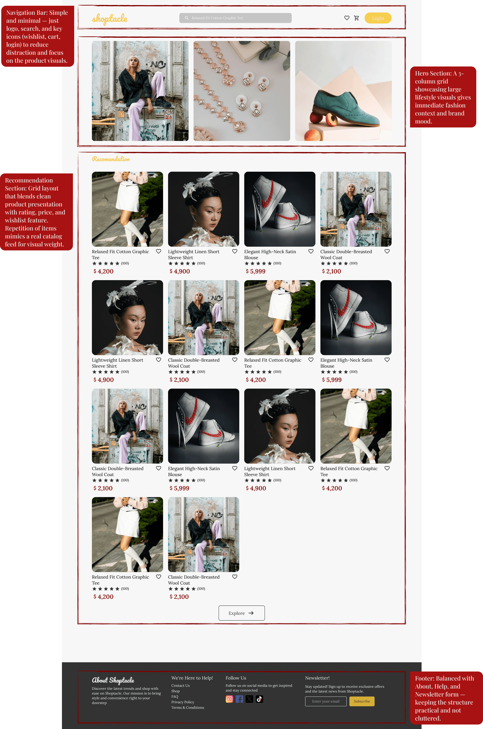Designing Shoptacle’s landing page helped me sharpen my visual storytelling skills. Even though it was a single-page design, I learned how to structure content that feels engaging, communicates clearly, and reflects the brand’s identity through typography, colors, and layout choices. It taught me that a strong landing page doesn't need to be complex—as long as it’s thoughtful.